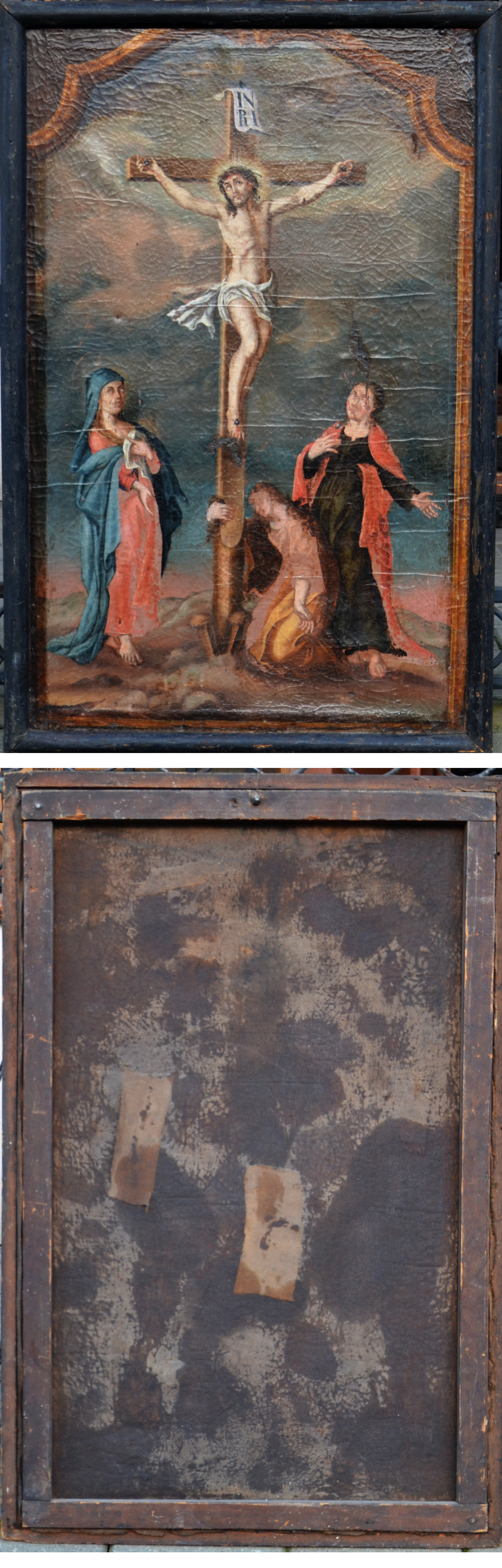 Malarz nierozpoznany - "Ukrzyżowanie Jezusa Chrystusa", obraz z pierwszej połowy XIX wieku. Obraz podniszczony w oryginalnej oprawie. Wymiary z ramą: 85,5x56 cm, bez ramy: 82x52 cm. Cena: 1800 zł.