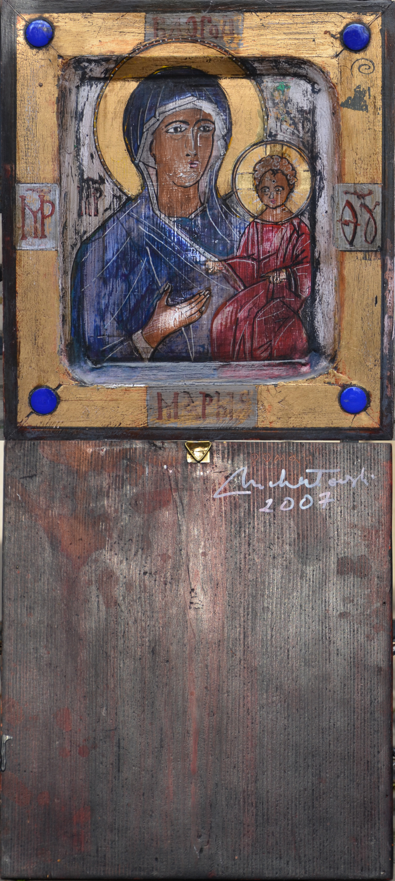 Roman Michałowski - "Matka Boska", ikona, sygnowana z tyłu: "Michałowski 09". Wymiary: 31,5x28 cm. Cena: 500 zł.