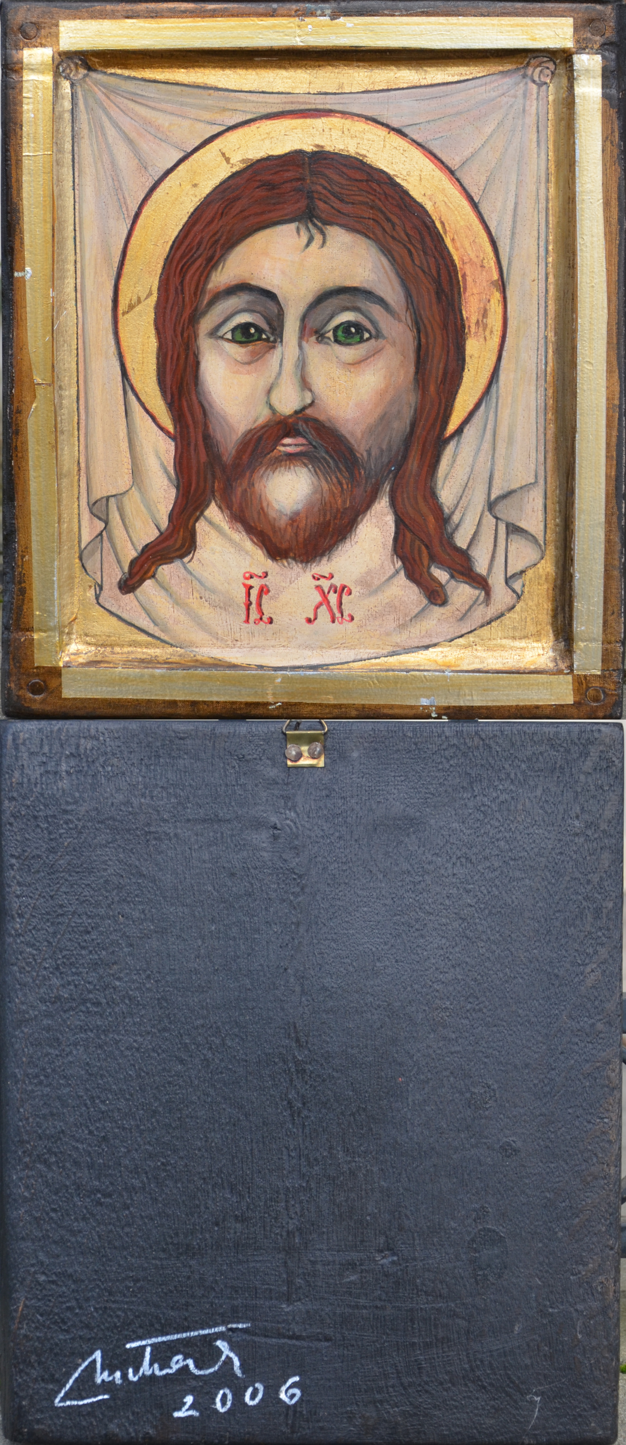 Roman Michałowski - "Mandylion na chuście", ikona, sygnowana z tyłu: "Michałowski 2006". Wymiary: 31,7x27,5 cm. Cena: 500 zł.