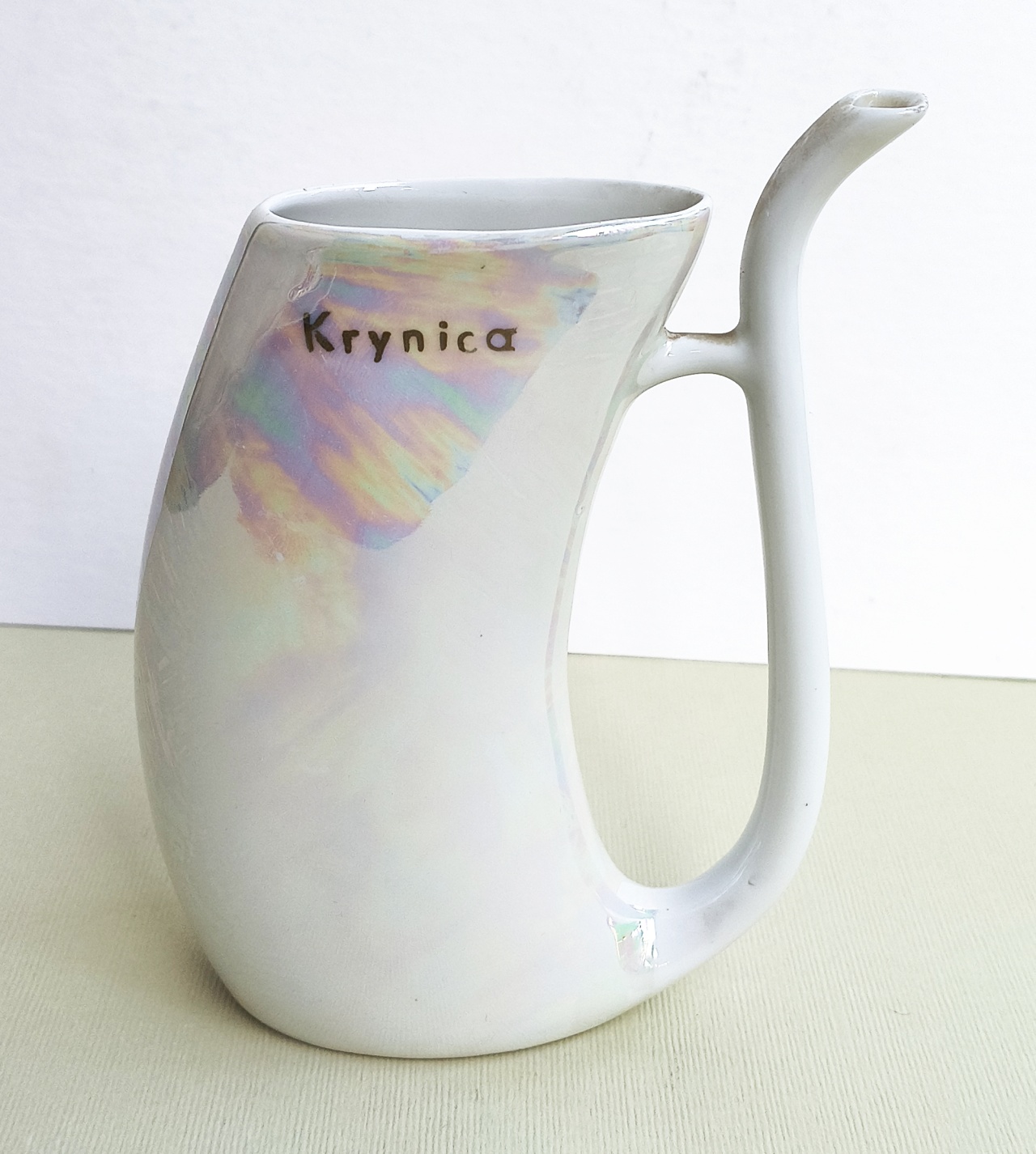 Pijałka porcelanowa z Krynicy, sygnowana Ćmielów. Wysokość 16,5 cm, szerokość 12 cm. Cena: 30 zł.