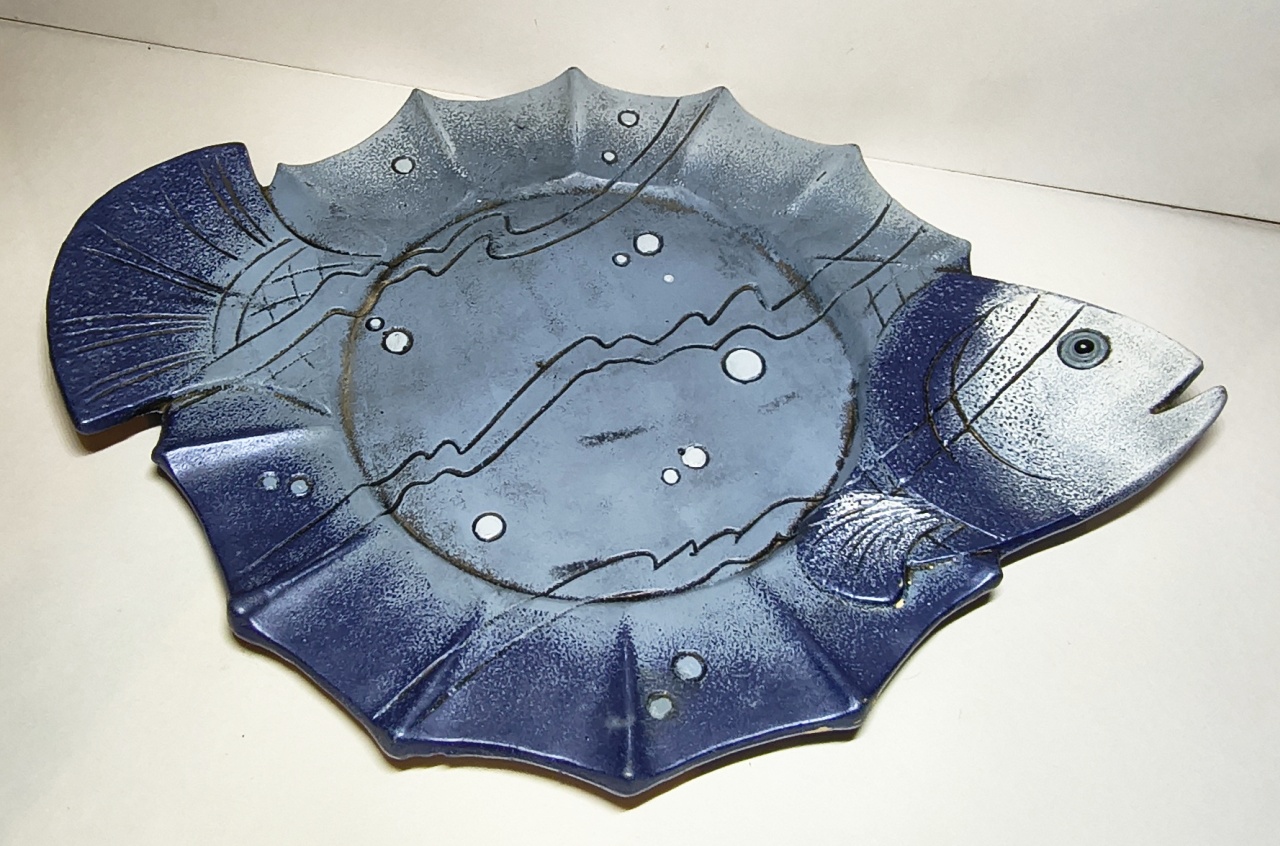 Talerz ryba, ceramiczny. Ręcznie malowany. Długość 34 cm, szerokość 25,5 cm, wysokość 3,5 cm. Cena: 50 zł.